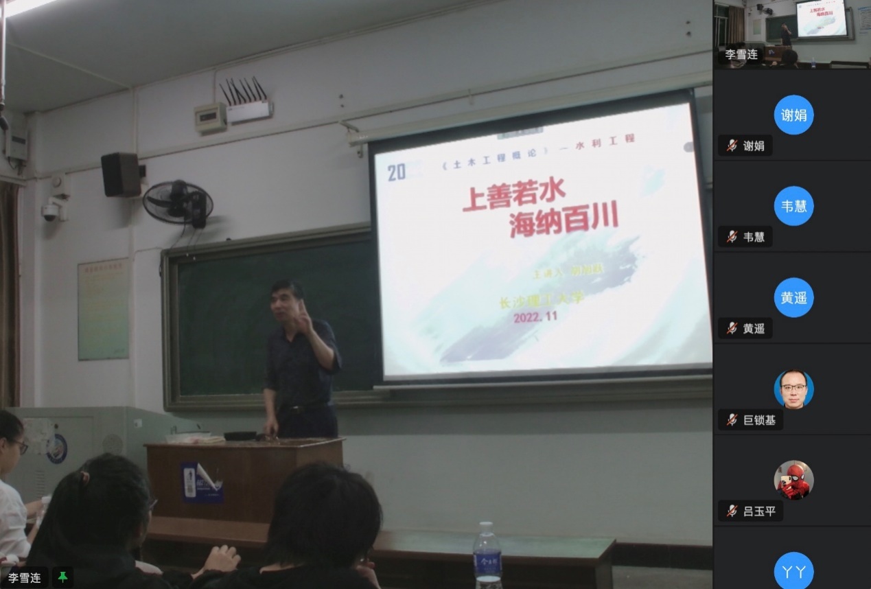 2022年11月10日晚上七点半,“行远学堂”第03期邀请到了水利与环境工程学院胡旭跃教授开讲,利用“道路工程智能建养课程群虚拟教研室”国家级平台采用线上线下相结合方式,为校内外道桥渡、测绘、机械制造等专业师生精彩讲授《土木工程概论》课程中“水利工程”章节。
