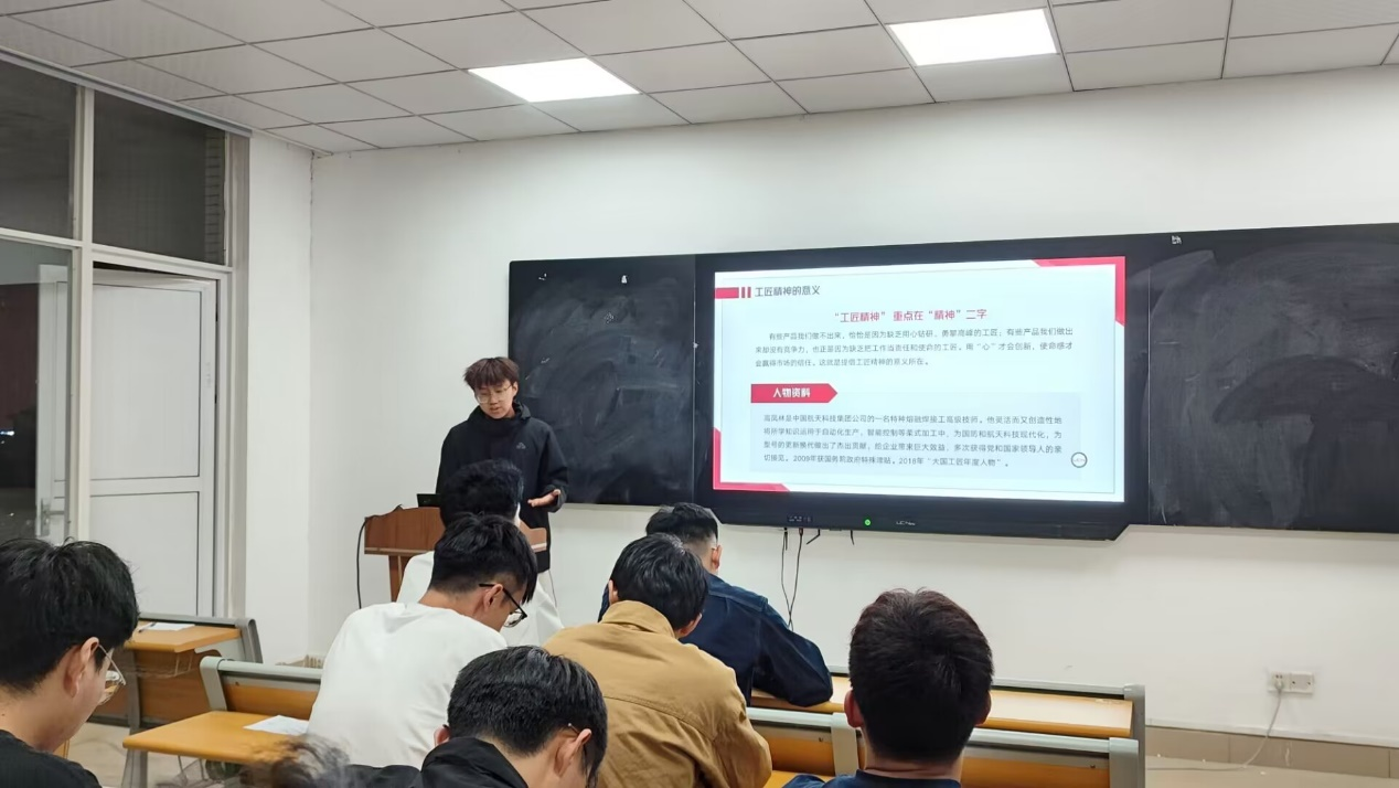 活动伊始,贾晓超同学以“弘扬新时代的工匠精神”为主题,详细阐述了工匠精神的内涵、意义以及个人如何培养工匠精神。他指出,工匠精神不仅仅是对技术的精益求精,更是一种对工作的执着和热爱。他结合自身学习和生活的实际,分享了如何在日常生活中践行工匠精神的心得体会。