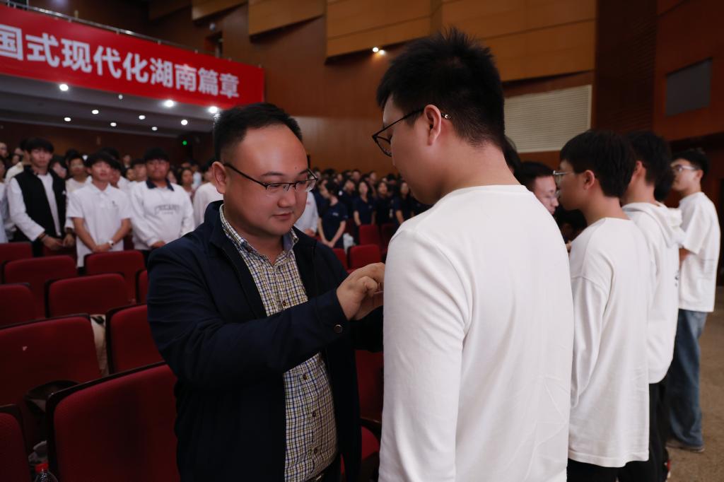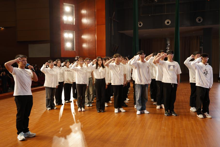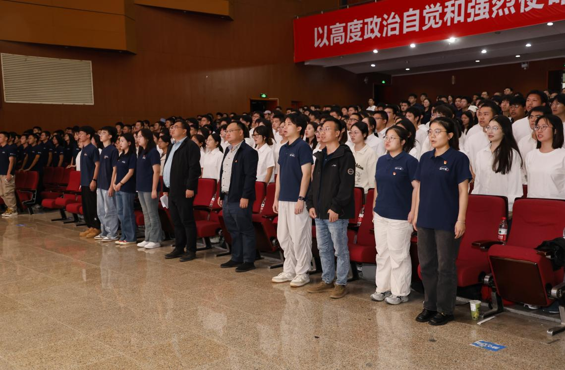 授徽仪式在庄重的《国际歌》合唱中拉开序幕。合唱结束后,授徽仪式正式开始。与会领导、老师和各支部支委依次为新入党同志授予党徽。随后,由本科生道路专业守正党支部的唐君虎同志带领全体预备党员面向党旗进行庄严的宣誓。