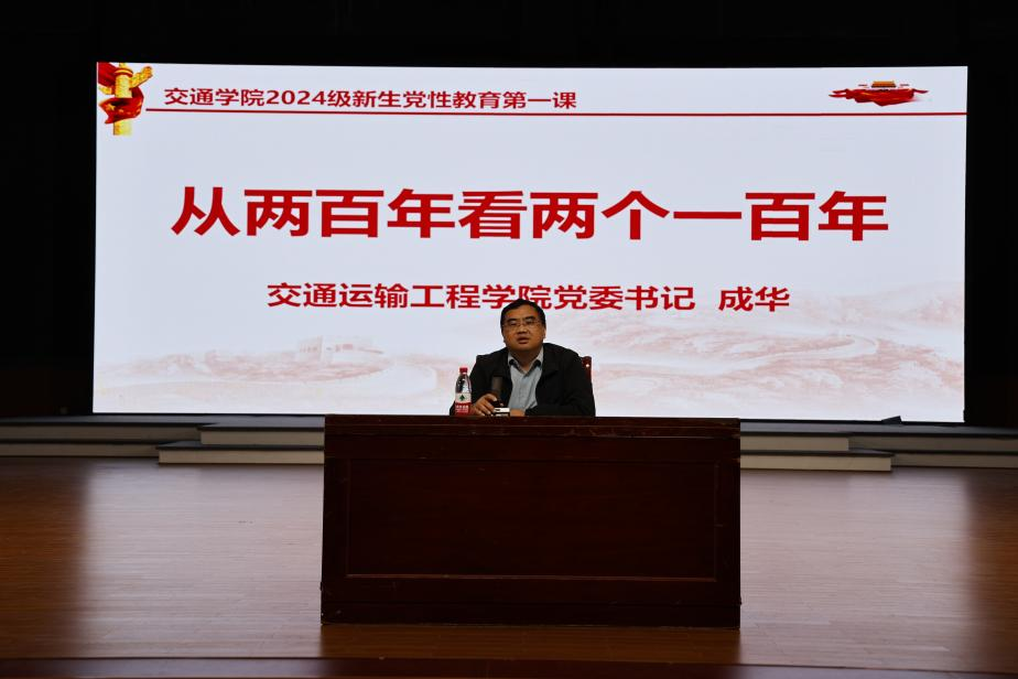 成华以《从两百年看两个一百年》为题,为全体新生讲授2024级新生党性教育第一课。他带领同学们回顾了中国近代以来波澜壮阔的历史征程,从1840年的鸦片战争开始,历经屈辱与抗争,到1949年新中国的成立,中华民族从苦难中崛起、从落后中奋进,开启了从独立自主到引领创新的辉煌历程,展现了中国共产党的担当与责任。他强调,全体交通青年要紧紧把握“两个一百年”奋斗目标的深刻内涵,锚定“交通强国”战略,秉承“英雄不问出处”的包容精神,积极担负起时代赋予青年的重任,将个人发展与国家命运紧密相连,勇于创新、勤于实践,为实现交通强国和中华民族伟大复兴贡献智慧和力量。