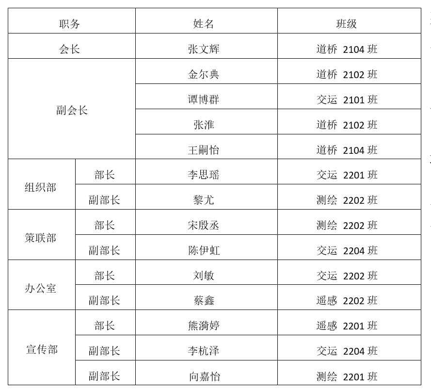 交通运输工程学院心理学研会于2023年6月15日召开2023-2024学年干部换届选举大会,秉承公平、公正的原则,现将交通运输工程学院心理学研会2023-2024学年学生干部名单公示如下: