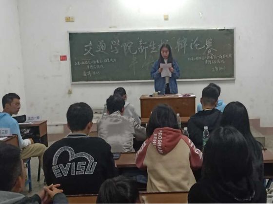 11月9日晚,交通学院在金盆岭校区13教举办2018“新生杯”辩论赛半决赛。交通学院云魂辩论队队员李佳波、李江山、向俊江、李禹志、皮伦勇、谭展琮、方睿敏、刘肖晓、梁静萍、刘兴科担任评委,交通学院团委、学生会学习部干事杨颖、李一鸣担任主席。
