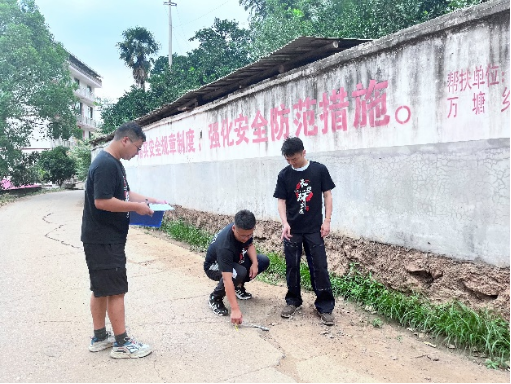 为服务乡村基础设施建设,实践团针对万塘乡乡村道路开展交通运行安全宣传和病害检测工作。顶着炎炎烈日,实践团成员走了四五公里路程,测量了二十几处路段,收集了大量数据。在了解当地道路现状的同时,也帮助当地村民进一步增强道路安全意识。