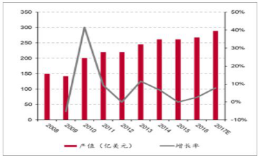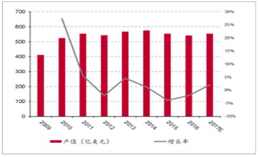 近年来,由于计算机和通讯等高科技产业的迅猛发展,为印刷线路板化学镀镍提供了广阔的发展空间。印刷电路板(PCB)是实现电子元件整体功能的重要部件。随着电子工业的高速发展,PCB的需求量与日俱增。经过几十年的发展, PCB行业已成为全球性行业,但近几年总产能呈现低速发展趋势。中商产业研究院数据显示,2016年全球 PCB市场产值达到542亿美元,虽相比2015年的市场产值下降2%,但仍是电子元件细分产业中比重最大的产业。未来在全球电子信息产业持续发展的带动下,全球 PCB市场有望维持2%左右增速。