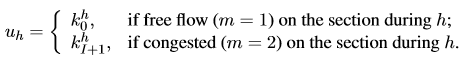 向量 是在时间步h的状态向量,矩阵Ah和Bh是时变的,它们在时间步h处取决于模式m。在自由流模式中m = 1,在拥塞模式中m = 2。wh表示状态方程的误差(由于错误或遗漏的计数引起,例如车辆变道)。输入uh是标量,并且与在计算域的边界处获得的测量相关(用于分别计算自由流或拥塞模式下的第一或最后一个元胞的密度)。事实上,如果整个路段在自由流或拥挤模式下:
