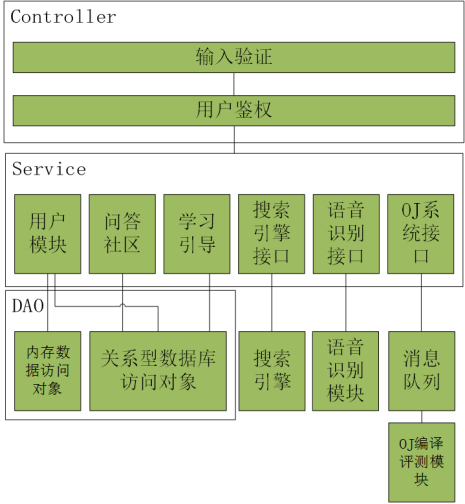 Controller层负责与用户交互收发信息,验证输入数据合法性,按照一定规则将请求分发给Service。Service层拆分处理请求。DAO层负责与数据库交互。我们采用微服务理念,将复杂而逻辑依赖少的模块(例如搜索引擎、语音识别、OJ测评)独立出来,以微服务的形式存在,服务与服务之间采用RPC协议通讯,每个服务专人负责,保证系统稳定性,降低单服务复杂度。