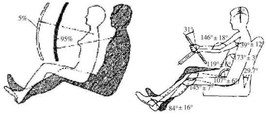 基于实验数据,分析出人在最舒适、操作最佳条件下的人机参数(包括:驾驶姿势、座椅结构、踏板及方向盘的距离和角度等)。测量统计所有车手人体参数,取其平均值,作为人体模型的基本参数。