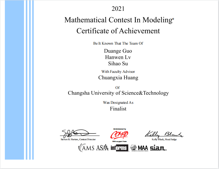 近日,2021年美国大学生数学建模竞赛结果正式公布。XK星空共获得特等奖提名奖(Finalist)1项和二等奖(Honorable Mention)6项的好成绩。数学与统计学院黄创霞教授指导的郭端格、吕翰文、苏思浩3名同学组成的代表队获得此次竞赛的特等奖提名奖, 实现了学校在此项比赛上的突破。