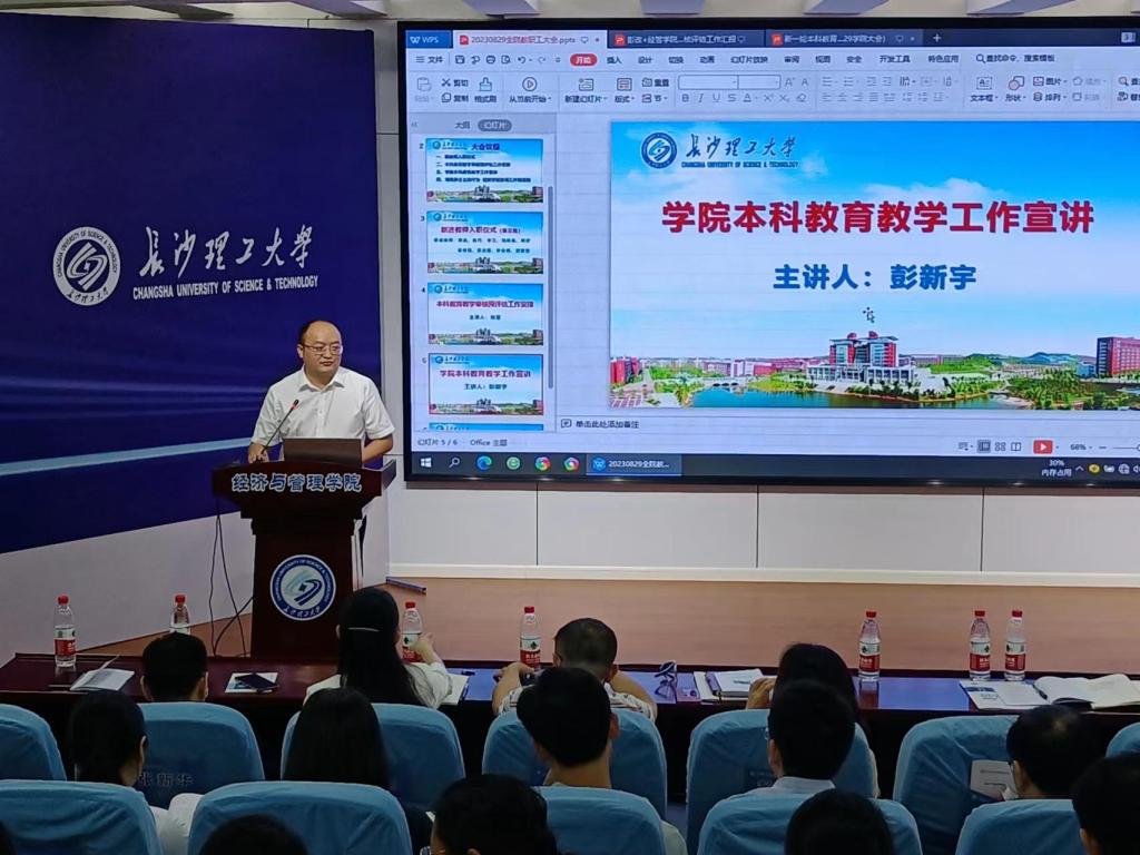 副院长(主持工作)彭新宇以“经济与管理学院本科人才培养目标、特色及质量保障体系”为题,回顾了学院前期审核评估工作的开展情况,介绍了本科教学概况及办学特色,分析了教育教学当前面临的挑战和机遇,并就教师迎评注意事项进行了详细说明。他强调,此次审核评估是一次抓管理、提质量、树形象的重要机遇,也是关系到人才培养质量持续有效提升、学院各项事业高质量发展的大事,全院师生要牢固树立一盘棋的思想,把“迎”的标尺调整到最高层次,把“评”的力度提升到最佳状态,把“建”的合力发挥到最大程度,凝心聚力、攻坚克难,打好打赢审核评估工作这场硬仗。