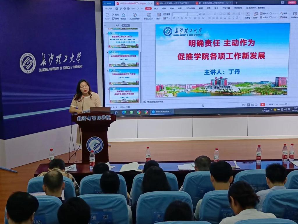 丁丹作动员讲话。她指出,新一轮审核评估与申报应用经济学博士点都是今年的大事、要事,不仅是对学院本科教育教学工作和高水平经管学院建设的一次全面体检,更是对学院发展进入新阶段、实现“由大向强”高质量发展的有力促进。她就加快学院推进迎评促建工作提了三点要求:一是充分认识本科教育教学审核评估的重大意义。全体教工要切实提高政治站位,深化教育改革,做好职业规划,加强社会对接,把思想统一起来、把精神振奋起来,形成人人知晓评估、人人参与评估、人人贡献评估的强大合力;二是充分营造全力以赴、全员参与、久久为功、迎评促建的良好工作氛围。要以学习贯彻习近平新时代中国特色社会主义思想主题教育为契机,牢固树立“一盘棋”思想,强化身份意识、纪律意识、责任意识,推动审核评估各项任务落地落实,以良好工作作风、优良教风学风迎接好评估;三是提升作风效能,坚决确保高质量完成迎评促建工作。要加强组织领导,压实工作责任,抓好统筹融合,广泛宣传动员,强化问责问效,切实做好审核评估的最后冲刺工作,交出本科教育教学审核评估的优异答卷。