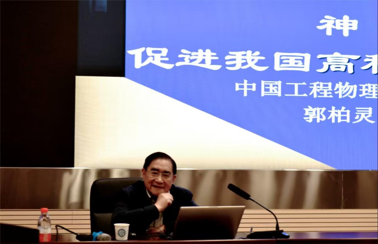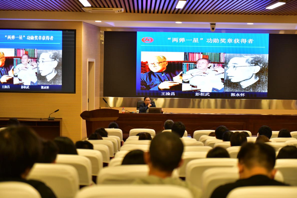 讲座中,郭柏灵院士向师生们介绍了我国“两弹一星”事业的发展史、我国核武器的研制背景、发展历程以及“两弹一星”事业取得重大突破的成功经验。接着,郭院士结合自身参与“两弹”的研究经历,用大量感人的事例和图片资料,向大家介绍了“两弹一星”功勋奖章获得者钱三强、彭桓武、郭永怀、朱光亚、周光召等老一辈科学家在艰苦的条件下,为“两弹一星”的研制成功作出突出贡献的感人事迹,深刻阐释了热爱祖国、无私奉献,自力更生、艰苦奋斗,大力协同、勇于攀登的“两弹一星”精神。