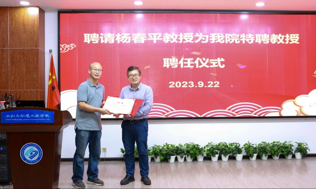 讲座开始前,学院为杨春平教授举行了聘任仪式,聘任杨春平教授为我院客座教授,副院长盛丰代表学院向杨春平教授颁发了聘书。在聘任仪式上,副院长盛丰介绍了杨春平教授的基本情况和学术成就,并对杨春平教授给予我院环境工程专业建设与学科发展的指导和帮助表示衷心感谢。