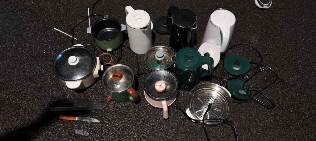 检查工作从9:00开始,对全院每间宿舍进行检查,经过将近2个小时的检查,共收缴高功率电器热得快1个、电热锅3个、电水壶6个、管制刀具3把、大型玩具弓箭1个。