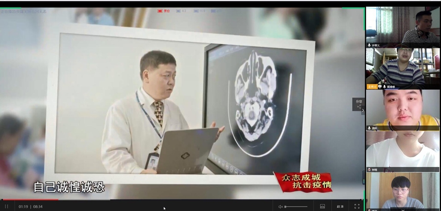 学生党支部全体党员共同观看了“英雄无悔,山河无恙”记录视频,致敬全体抗疫英雄。此次抗击疫情行动背后,有许许多多不惧风雨、无私奉献的感人事迹。“60分贝暖医”江学庆、“准爸爸”彭银华、“与死神打交道的人”丁敏等等。当疫情来袭,无数的医护人员毅然坚守在疫情的“风暴眼”,践行“你若生死相托,我必全力以赴”医者仁心的承诺。在这个特殊的春天,无数优秀的中华儿女投身到抗击疫情的第一线,他们忘我奉献、无悔冲锋,为的是家国安好、山河无恙,他们是这个新时代的英雄。