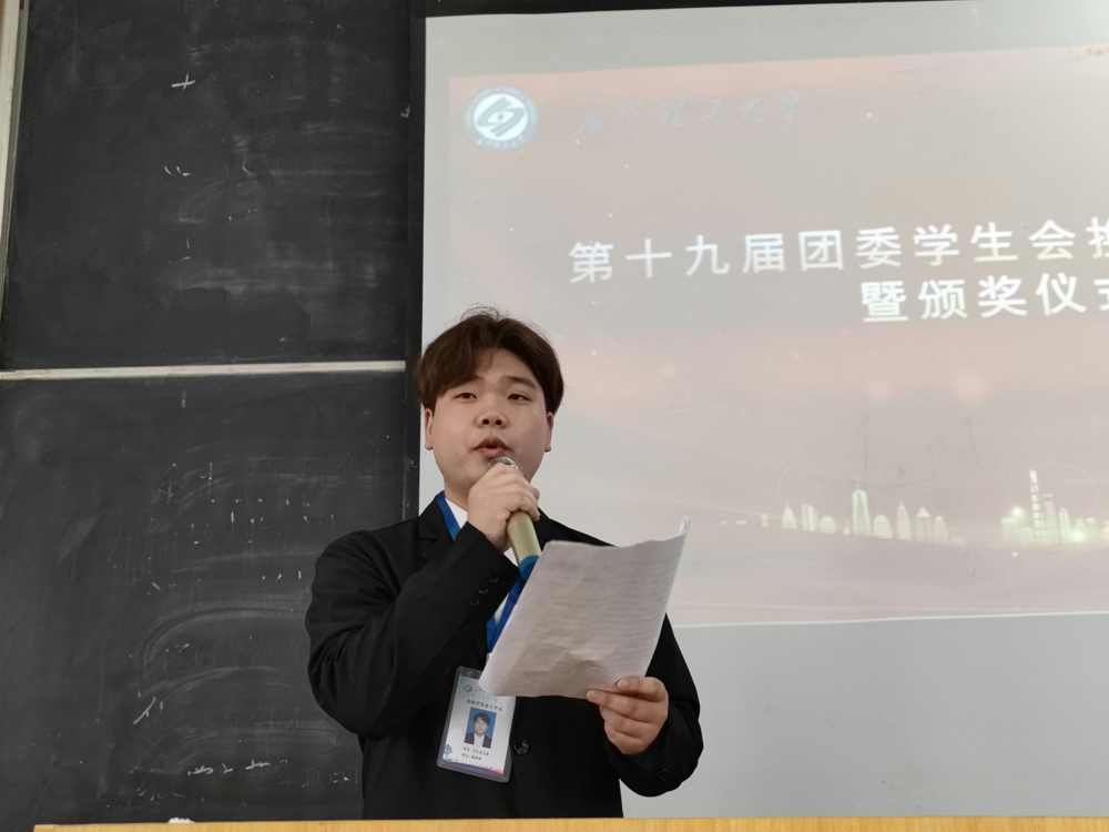 竞选演讲开始前,第十九届团委学生会主席谢维博代表十九届团委、学生会做了工作总结发言,总结了一年来的团学工作及取得的成绩。随后,学院领导、老师为第十九届团学干部颁发了聘书和纪念品。