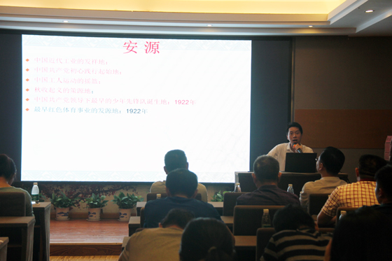 安源路矿工人运动纪念馆讲师黄领为大家作了一堂题为《毛泽东开创安源革命斗争的伟大实践及其现实启示》的讲座。他从毛泽东的早期思想入手,讲述毛泽东与安源的历史渊源,接着以毛泽东先后八次到安源开展革命运动的历史事件,具体阐述毛泽东如何开创安源革命的伟大实践和十年波澜壮阔的安源革命斗争史,及其现实启示。