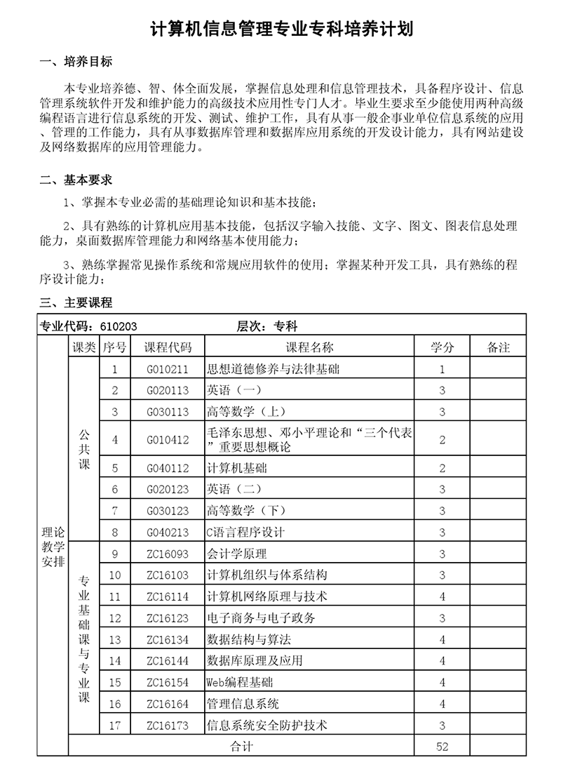 专科培养计划-专业代码:610203 计算机信息管理专业