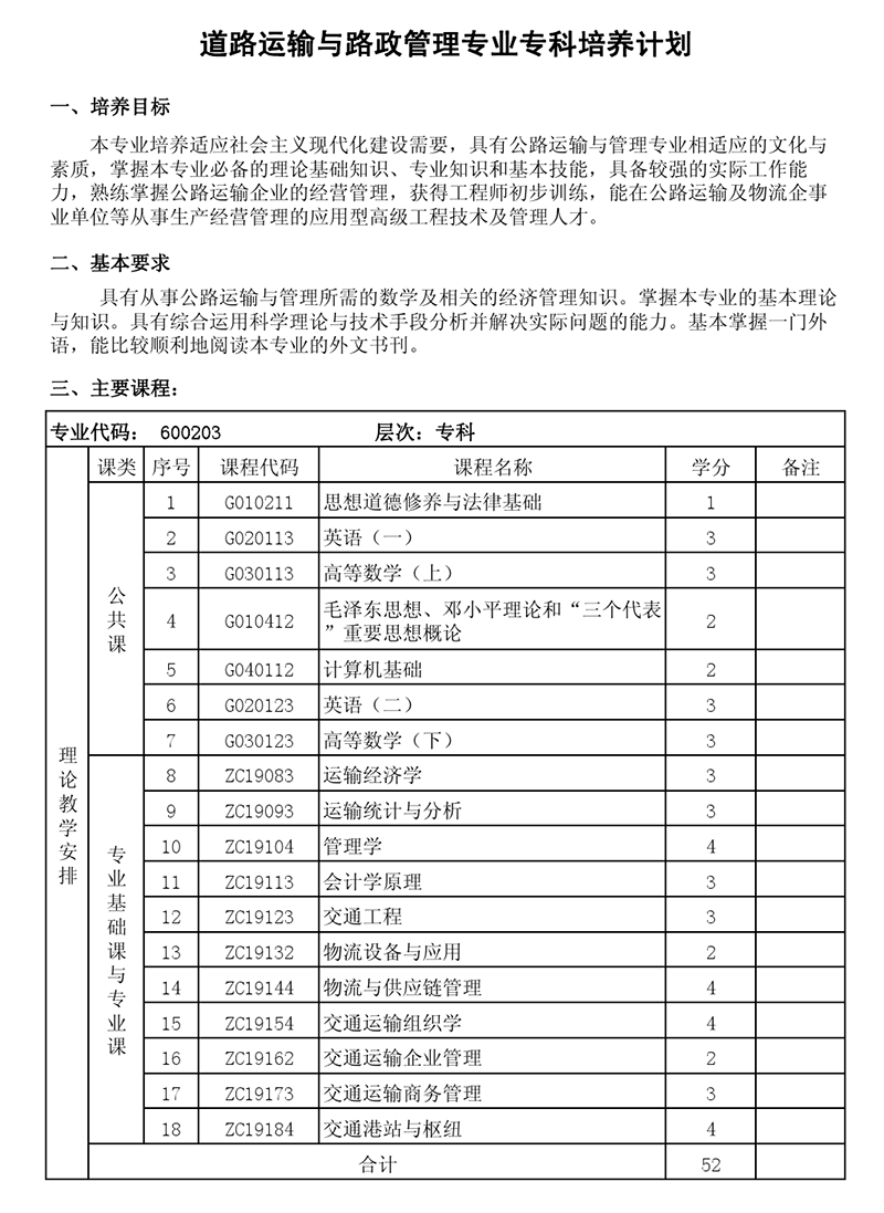 专科培养计划-专业代码:600203 道路运输与路政管理专业
