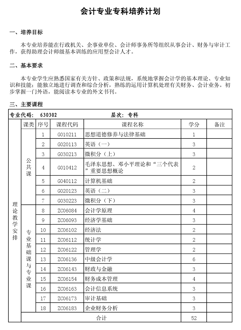 专科专科培养计划-专业代码630302 会计专业