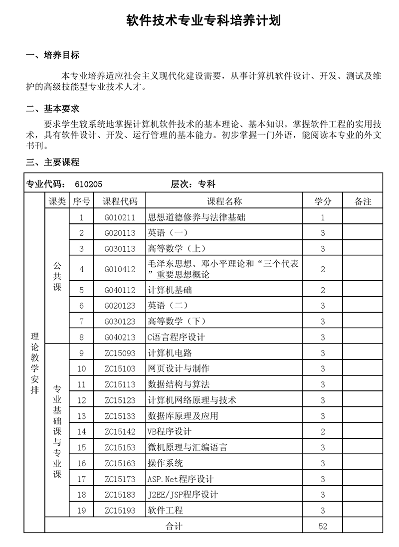 专科培养计划-专业代码:610205 软件技术专业