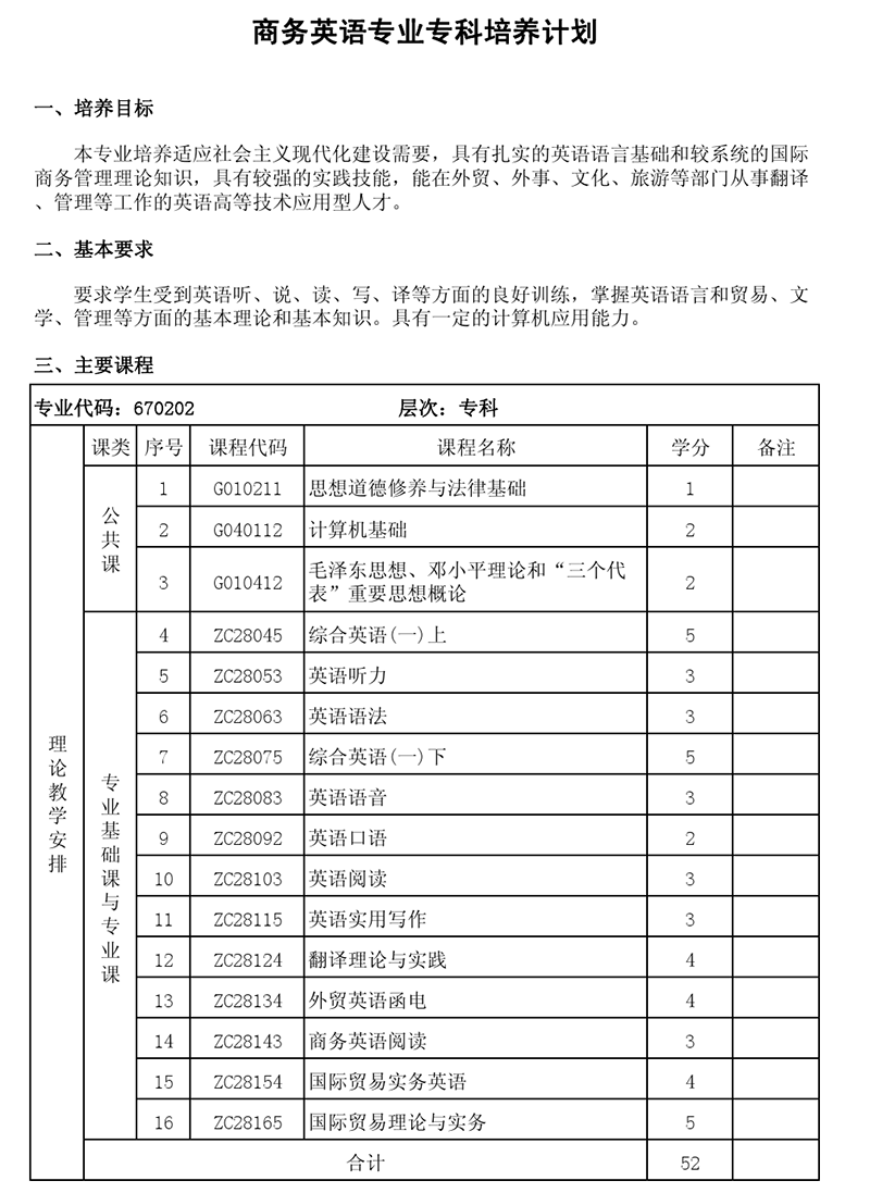 专科培养计划-专业代码:670202 商务英语专业