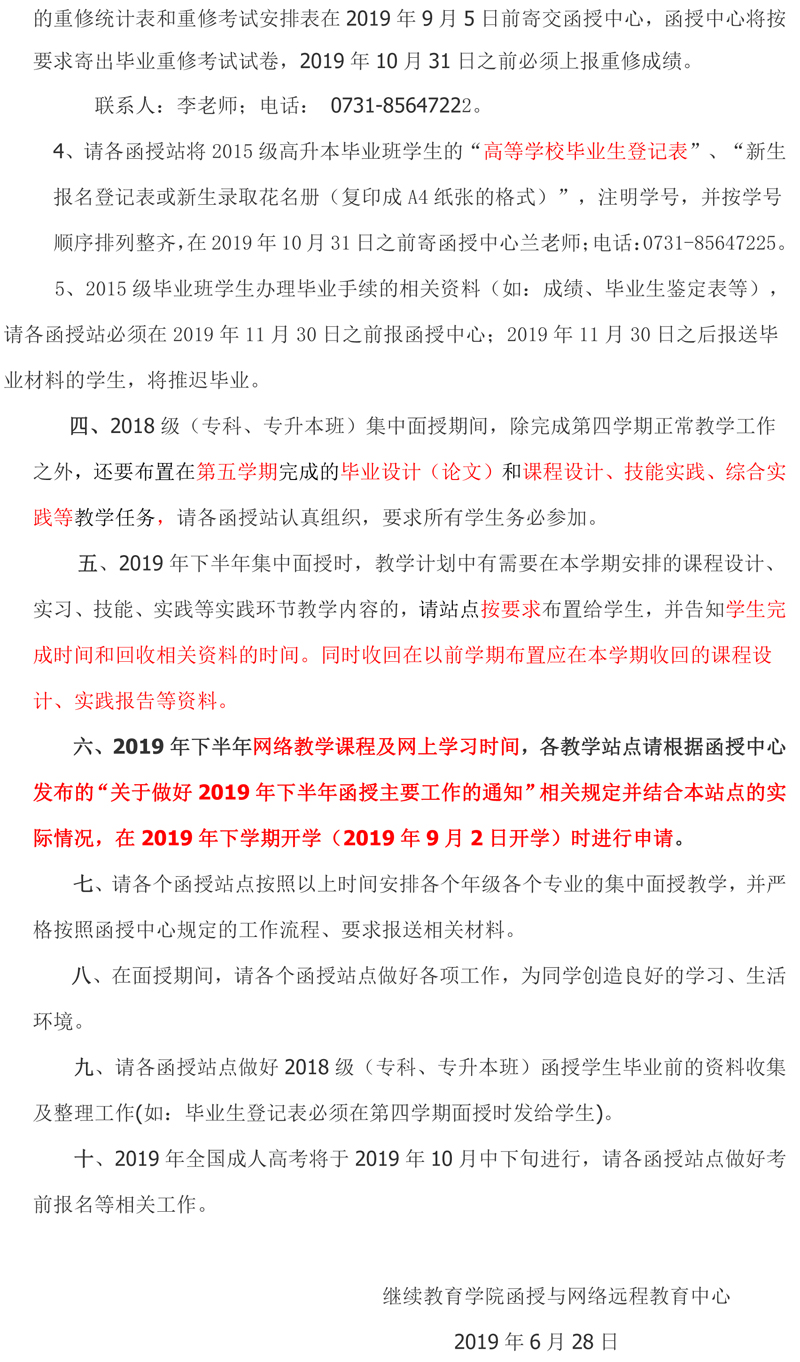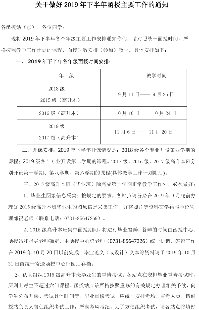 关于做好2019年下半年函授主要工作的通知
