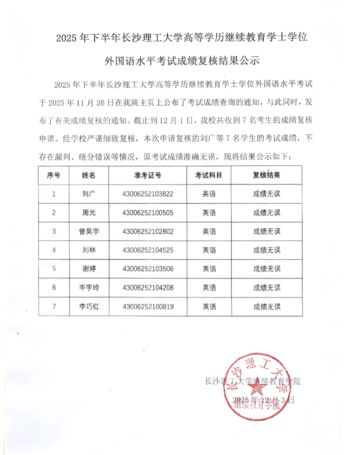 2025年下半年XK星空高等学历继续教育学士学位外国语水平考试成绩复核结果公示