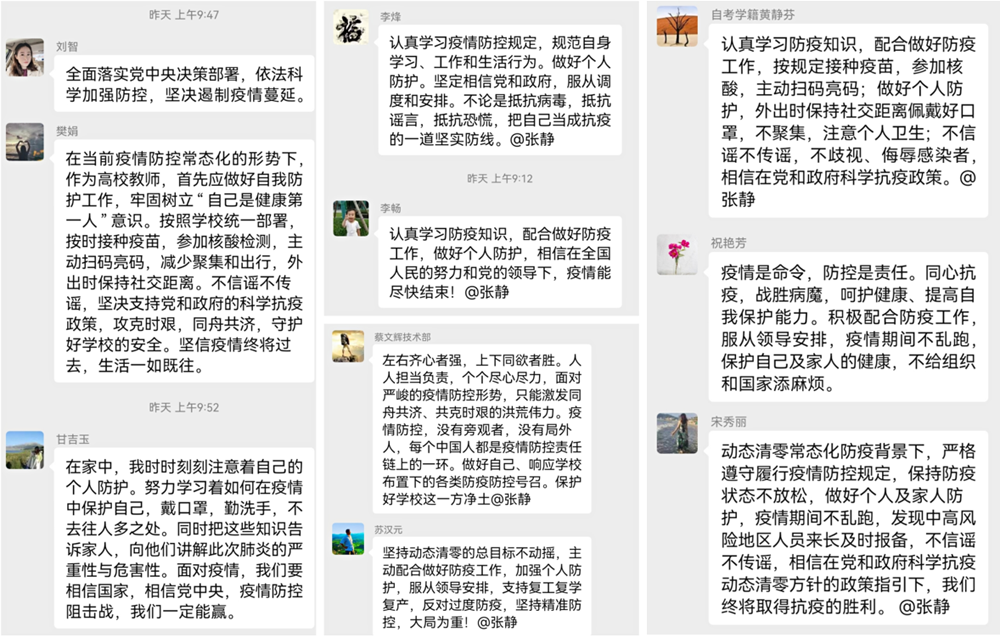 部门全体老师在重点标记内容的指引下,进行了认真自学,并在工作群发布了自己的学习体会,纷纷表示,要努力提高自我保护能力,积极配合疫情防控,相信党和政府的决策部署,守护好自己、家人和学校的健康安全。