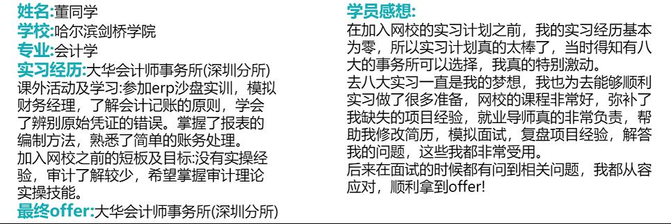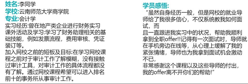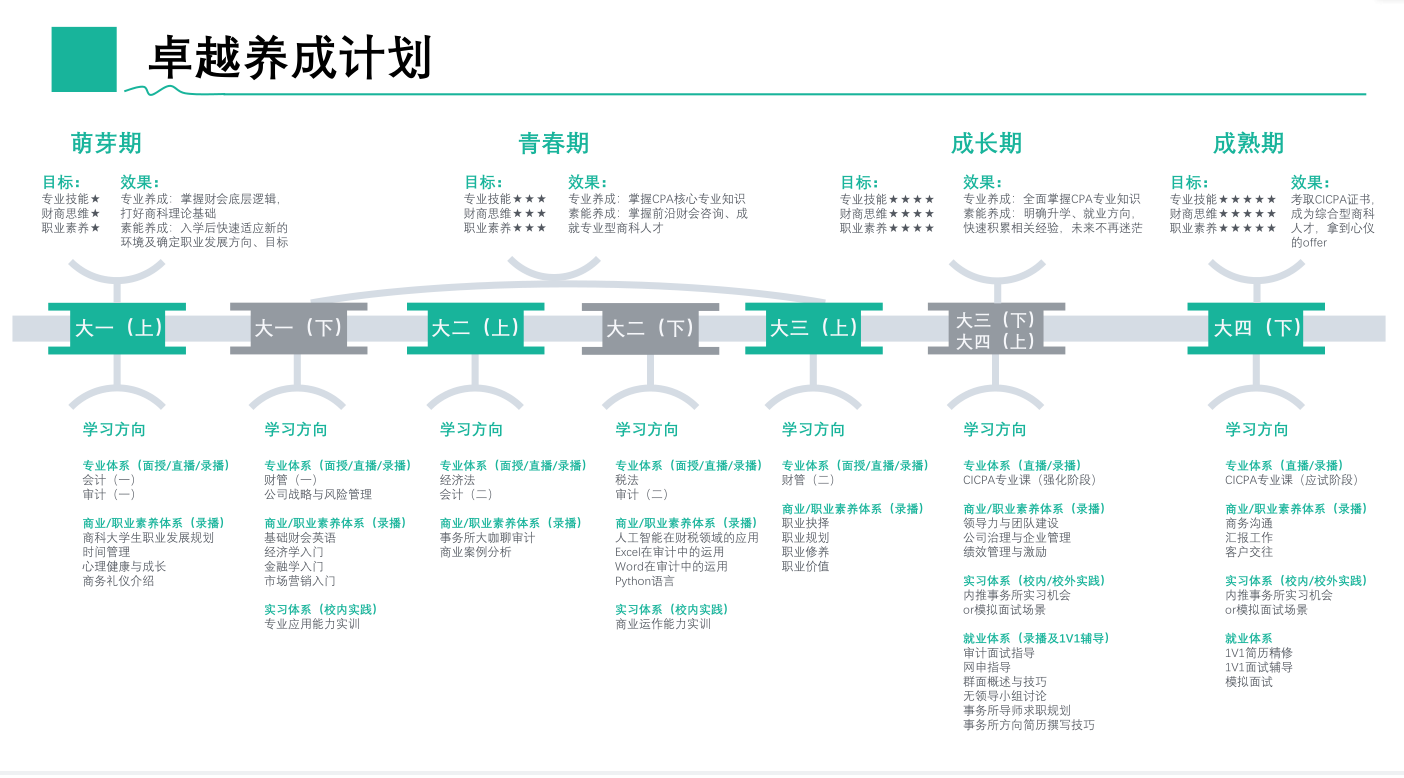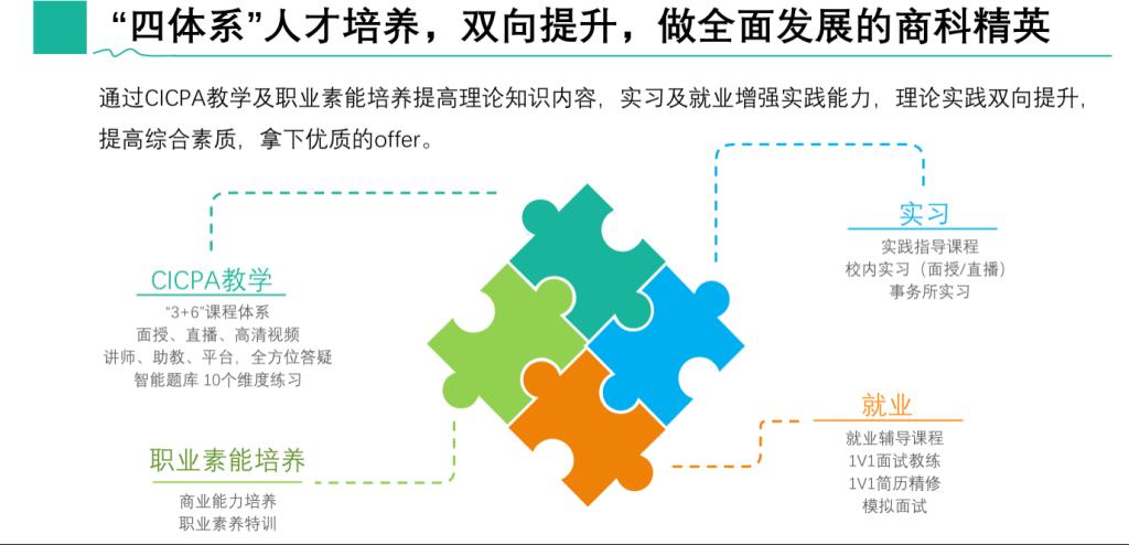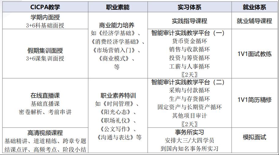 本培养方案针对本科低年级大学生量身定制,从财务基础知识入门到CPA专业知识全面学习,由浅入深,结合职业素养实训实习就业全方位培养体系计划,即在大学学习了CPA专业知识,也同时提升了财务实操的专业能力,提供实习就业指导,领先一步提前了解、适应职场。