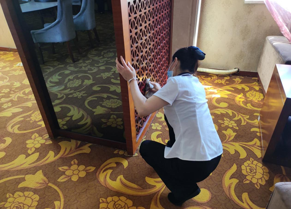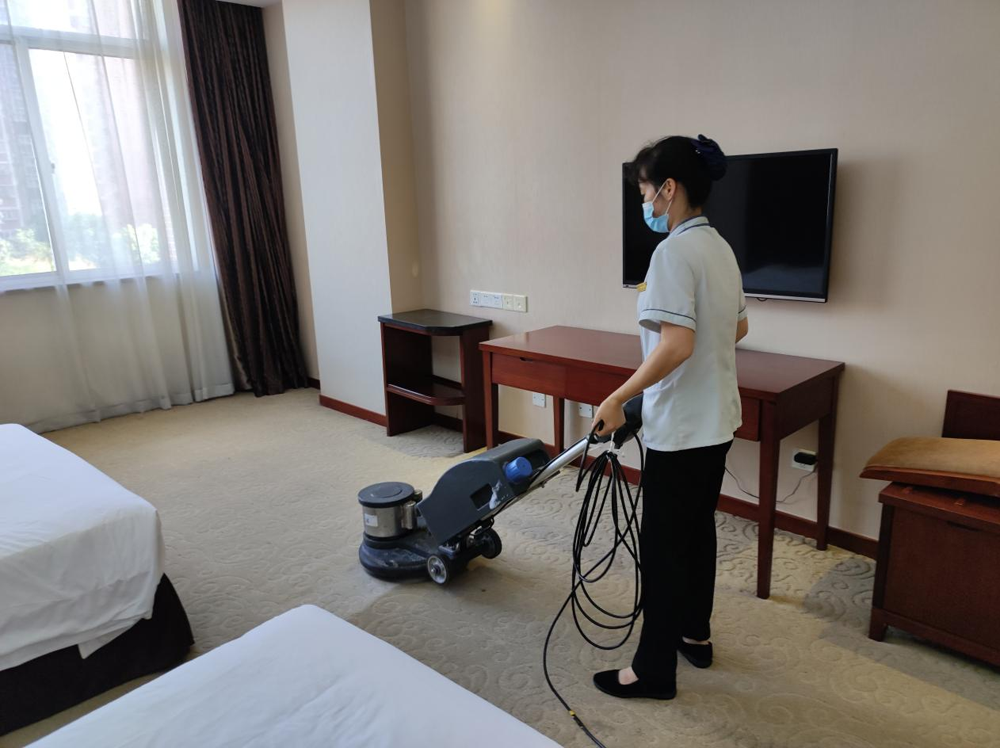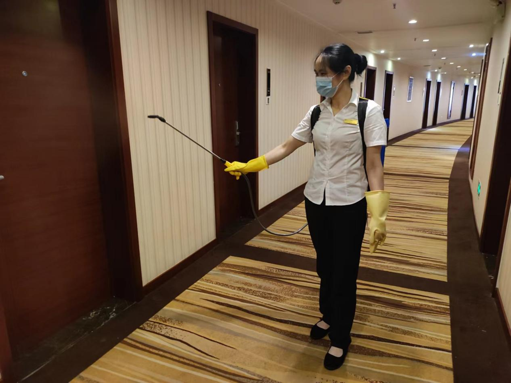 1、总经理谢治强带领管理人员对即将入住的一百余间房间进行全面检查,包括房间设施、照明、墙面、地面、淋浴间等,楼层班组对房间进行精细洒扫、抹尘、消杀,并联合维保部按要求将原来的房型布置成三人间,添加床位,增补物品,对房间设施设备进行修护,有条不紊地进行入住前的准备工作。