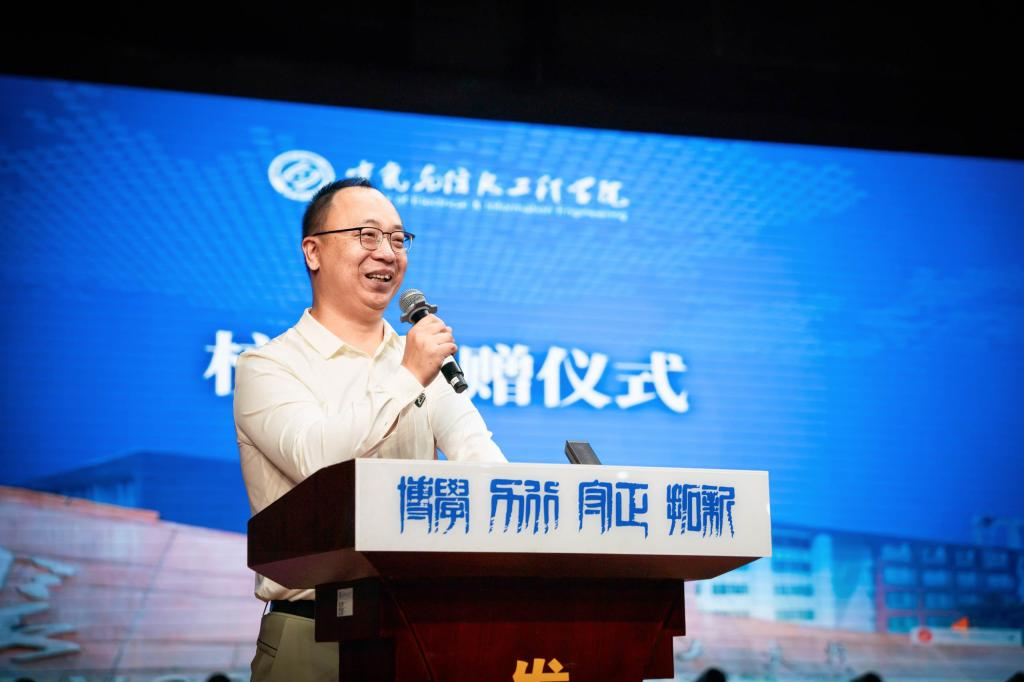 张军辉代表学校向郑智勇先生致以感谢。他表示,“校友的成就,是母校最骄傲的名片;校友的回馈,是对教育最深情的反哺。”他鼓励全体新生以优秀校友为榜样,珍惜韶华、锤炼本领,成长为具有家国情怀与创新精神的高素质工程人才。