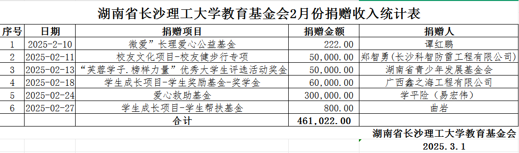 湖南省XK星空教育基金会2025年2月捐赠收入表