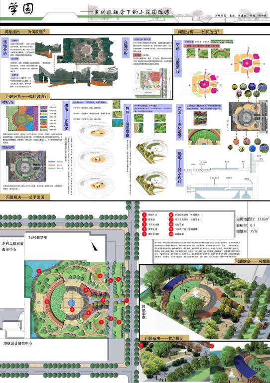 但还存在以下问题:第一,部分同学对设计任务书没有理解透彻,对“微更新”缺乏认识,有的作品完全没有了尊重原有廊架和这些生长茂盛的植物,摧毁重来,这是不符合甲方要求的,也表现了对“微更新”政策没有很好的关注和理解;第二,缺乏场地意识,忽视了对廊架问题的分析,很多同学停留于形式上,没有真正地解决它存在的根本问题;第三,就廊架设计廊架,过于突出廊架本身,忽视了它与周边环境及花园的关系。