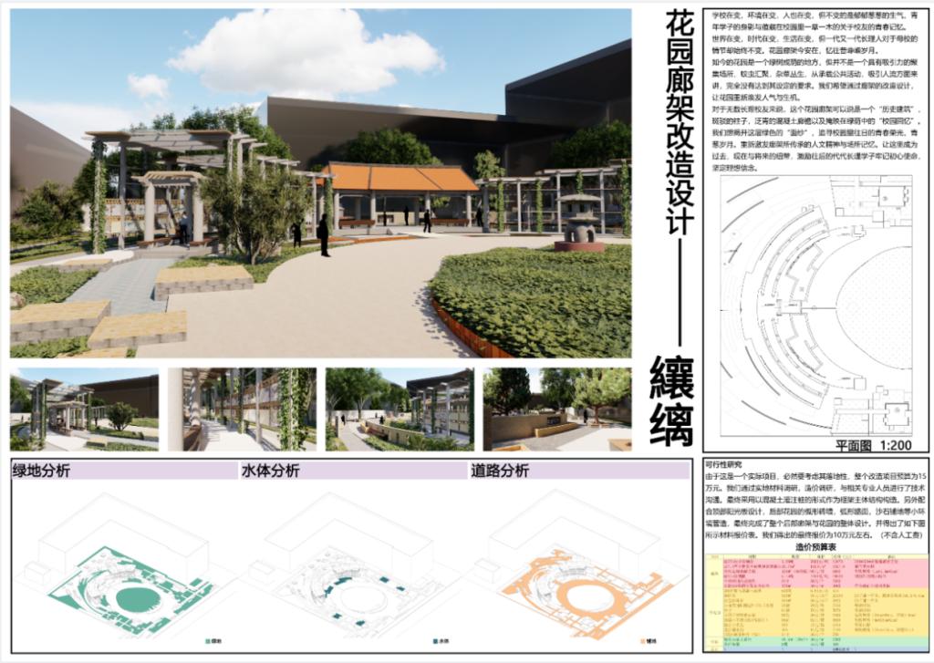 设计说明:为了保留花园廊架原有的文化记忆,设计遵循原先的三段式构架,中间部分为视觉中心,预留较大面积用于同学们交流讨论,前部开敞取景整个广场,后部用若干旋转的格栅门将廊架与之后的景观相隔;左右两部分呈大致对称但细节各不相同的构架,垂直遮挡与水平相交处为圆弧状,同学们可以在上面半躺休息,另外根据空间的围合度差异赋予展览、涂鸦、静思、学习等功能。考虑到原有的花藤长势茂盛,易招引蚊虫,在廊架设计部分区域栽种薄荷、薰衣草等有驱蚊作用的植物。廊架从两边到中间高度递增,增加空间层次。