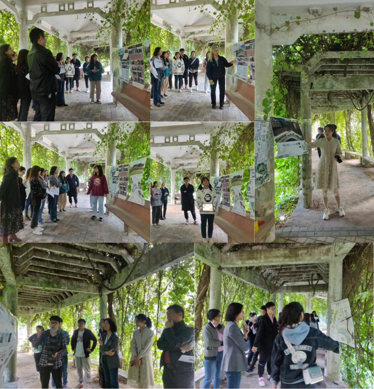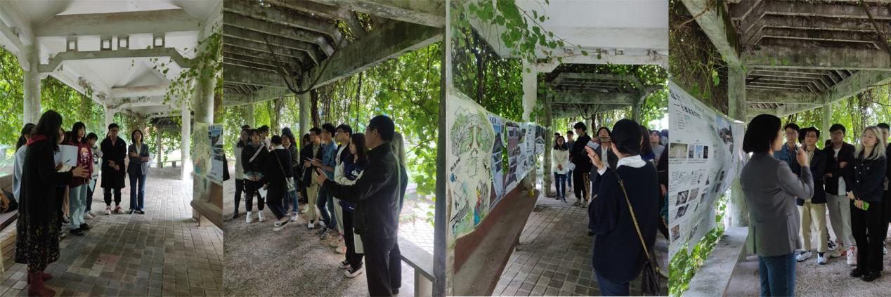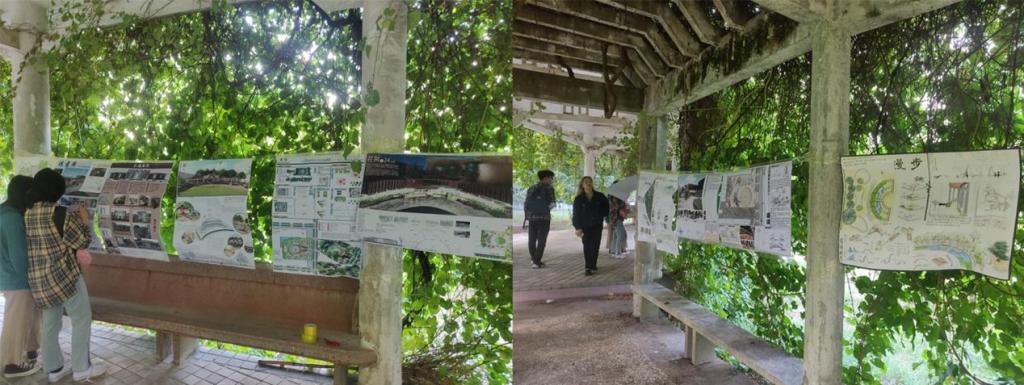 ↑在花园廊架进行实地评图,同学们的方案图纸依次排开