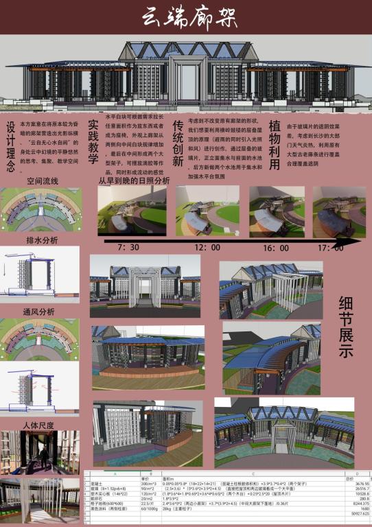 设计说明:本方案意在将原本昏暗的廊架营造出光影纵横、“云自无心水自闲”的身处于中幻境的平静悠然的思考、集聚、教学空间。