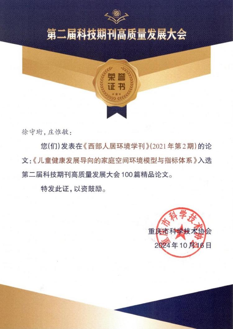 期间,举行了“第二届科技期刊高质量发展大会100篇精品论文”颁奖典礼。经过严格的评审和筛选,最终评选出80篇理、工、农、医学领域和20篇出版学领域的精品论文。我院徐守珩老师与清华大学建筑学院庄惟敏院士在《西部人居环境学刊》刊发的《儿童健康发展导向的家庭空间环境模型与指标体系》一文入选名单。