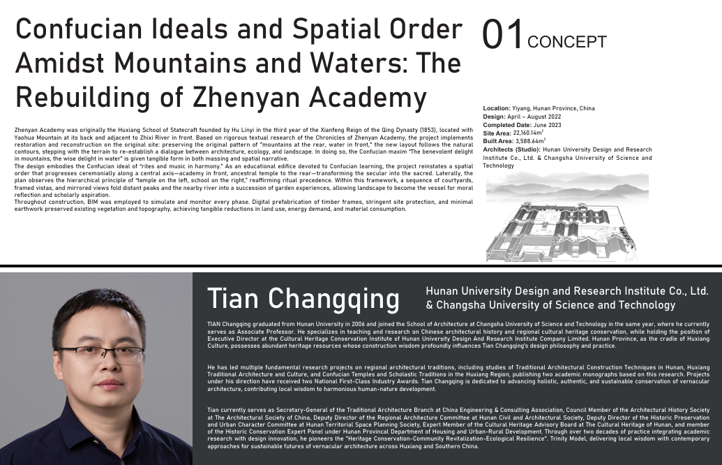 近日,我院田长青老师团队主持设计的传统建筑项目《Confucian Ideals and Spatial Order Amidst Mountains and Waters: The Rebuilding of Zhenyan Academy》(《介于山水之间的士人理想与空间秩序:箴言书院重建项目》)成功入选第十四届巴西圣保罗国际建筑双年展中国建筑展,并于2025年9月18日至10月19日在巴西著名建筑师奥斯卡·尼迈耶设计的圣保罗伊比拉普埃拉公园OCA展馆向全球观众展示,该项目是本次湖南地区唯一入选项目。本次圣保罗双年展以“极限:为过热星球打造的建筑”为主题,中国展区学术主题定为“共享·共生·共栖”,旨在全球气候危机背景下,探寻建筑如何回应生态挑战并传承人文价值。该项目深度契合了这一主题:项目基于“箴言书院志”的历史记载,“师其意而不师其迹”,精妙阐释了如何从中国传统儒家哲学审美意趣与山水智慧中汲取灵感,构建根植于本土营造技艺、与自然和谐共生的传统书院建筑空间秩序。作品不仅关注精神空间的营造,更强调了建筑作为物质载体在物理层面对“过热星球”的降温作用——即通过重构士人美学与传统生态智慧,为现代人提供一片栖息身心的诗意绿洲,这正是对“为过热的星球而设计”的深刻呼应。