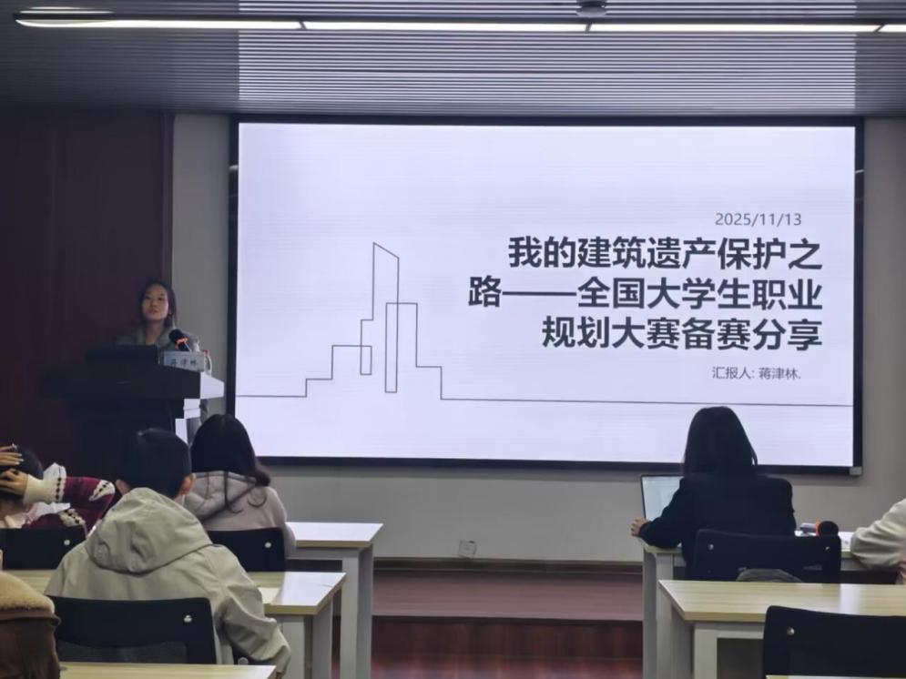 为帮助建筑学院学子更好地备战全国大学生职业规划大赛,提升职业规划能力与就业竞争力,2025年11月13日,建筑学院在16号教学楼314教室举办备赛经验分享会。本次分享会由学院常驻志愿者郑梦情主持,特邀建筑学2102班蒋津林担任主讲。蒋津林在第二届全国大学生职业规划大赛就业赛道中荣获省级三等奖,她围绕“建筑遗产设计师”这一职业目标,从竞赛认知、备赛要点到经验总结等多个维度,为在场同学带来了一场内容充实、实用性强的事迹分享。