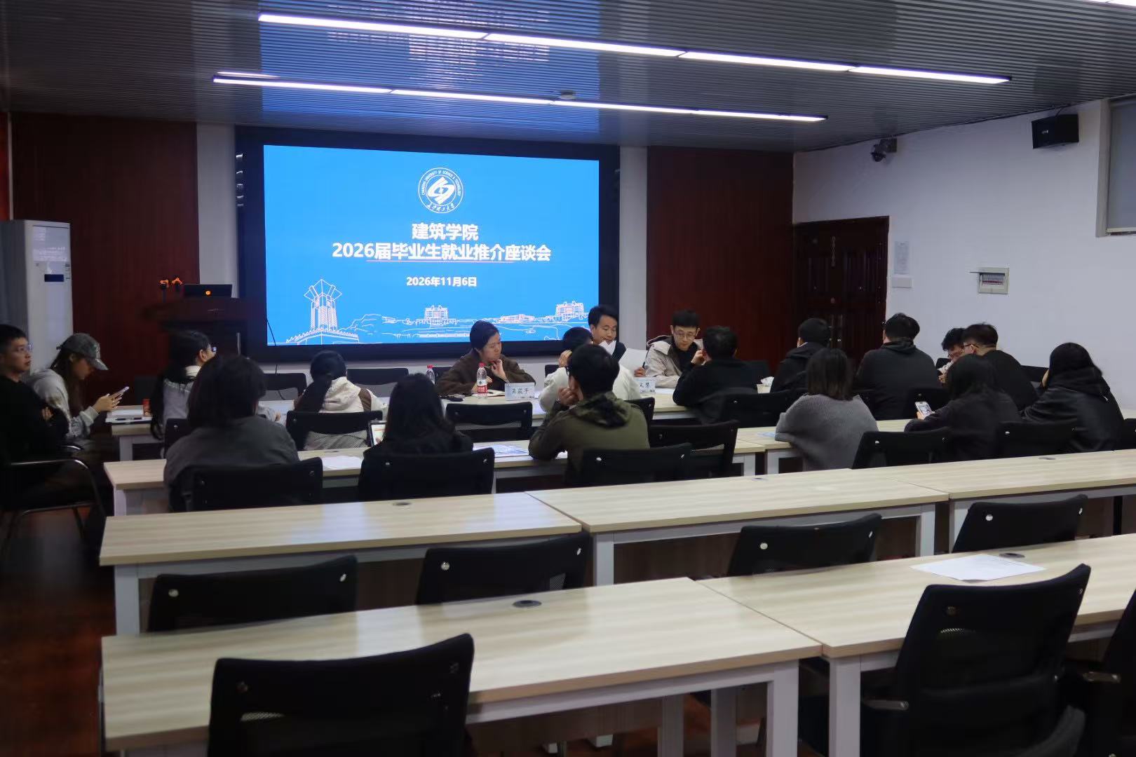 11月6日,建筑学院2026届毕业生就业座谈会在16教314召开。学院党委副书记肖义慧、副院长吴荻子、学工办王宇霖老师以及全体毕业班本科生、研究生参加会议,本次座谈会围绕当前就业市场趋势、岗位适配度以及求职策略三大方面与在场毕业生进行点对点的交流与指导。