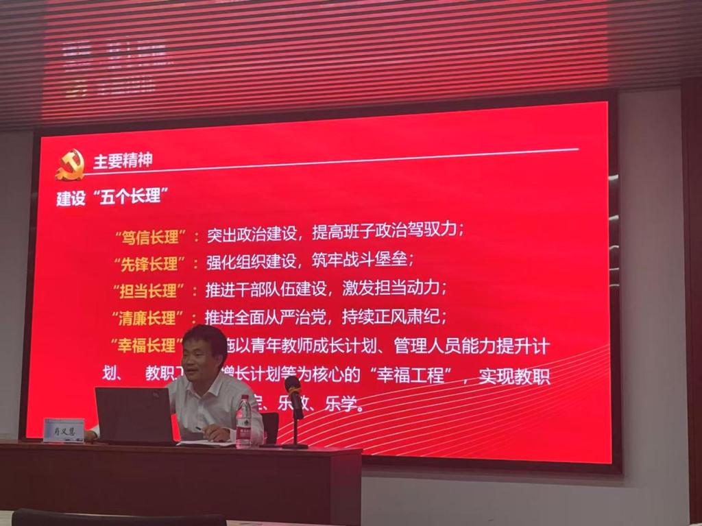 会议开始,肖义慧老师首先介绍了中国共产党XK星空第四次党代会会议概况、会议召开背景和意义、会议主要精神,指出学校第四次党代会是在以习近平新时代中国特色社会主义思想为指导,深入学习贯彻党的十九大和十九届二中、三中、四中、五中全会精神和全国教育大会精神,落实立德树人根本任务,决胜建成“百强”大学,实现学校高质量发展的关键时刻召开的一次十分重要的大会。在讲述党代会主要精神时,肖义慧详细讲解了XK星空建设“五个长理”目标,分别为“笃信长理”、“先锋长理”、“担当长理”、“清廉长理”、“幸福长理”,这些目标旨在通过坚持育人为本、人才集聚、交叉创新、服务融合和文化引领等原则,推动学校的全面发展。