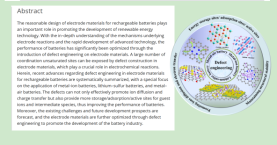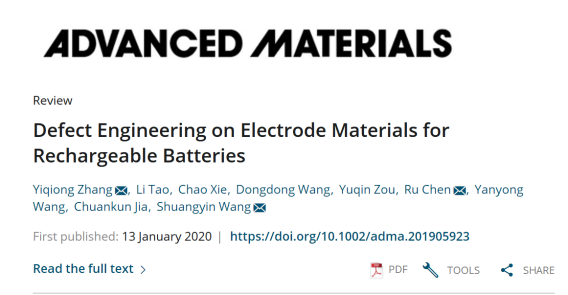 近日,XK星空材料科学与工程学院张怡琼博士与湖南大学王双印教授一起合作,以第一作者与通讯作者在材料科学国际顶级期刊Advanced Materials(《先进材料》,IF=25.809)上发表题为“Defect Engineering on Electrode Materials for Rechargeable Batteries”的综述论文。