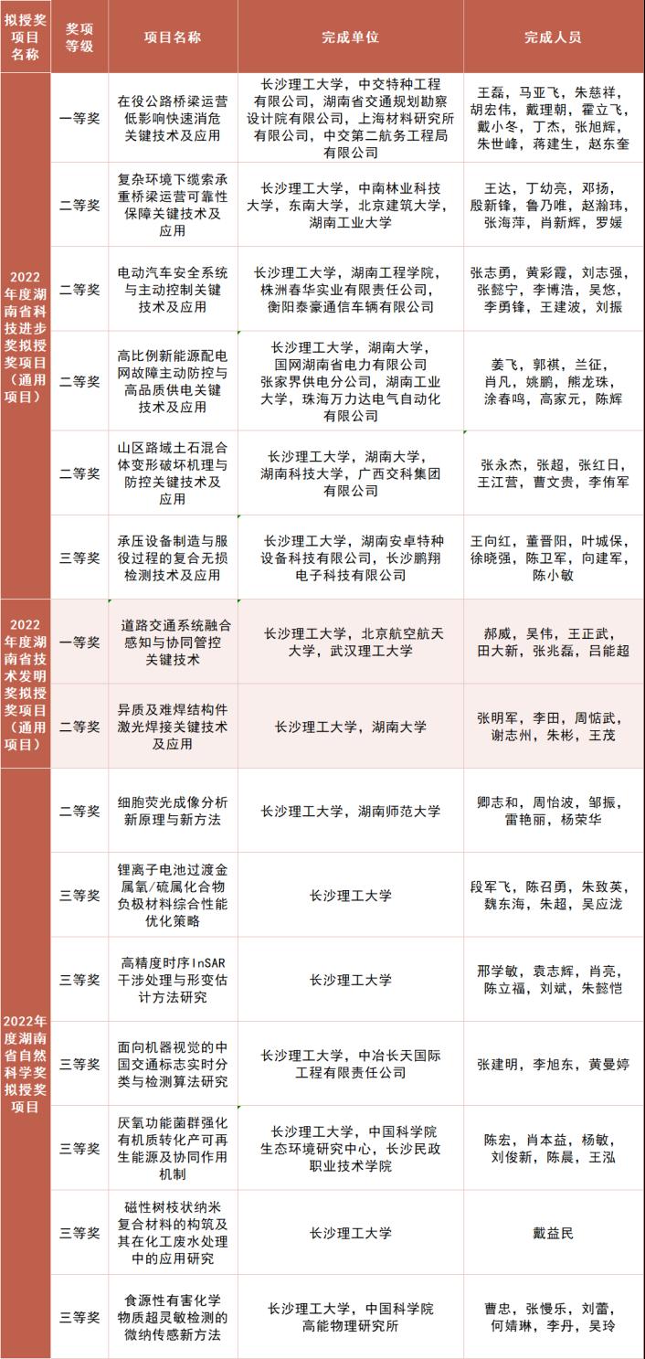 其中,XK星空土木学院王磊教授主持完成的“在役公路桥梁运营低影响快速消危关键技术及应用”获湖南省科技进步奖一等奖,交通学院郝威教授主持完成的“道路交通系统融合感知与协同管控关键技术”获湖南省技术发明奖一等奖。此外,XK星空还主持获二等奖6项(自然科学奖1项、技术发明奖1项、科技进步奖4项),三等奖7项(自然科学奖6项、科技进步奖1项)。