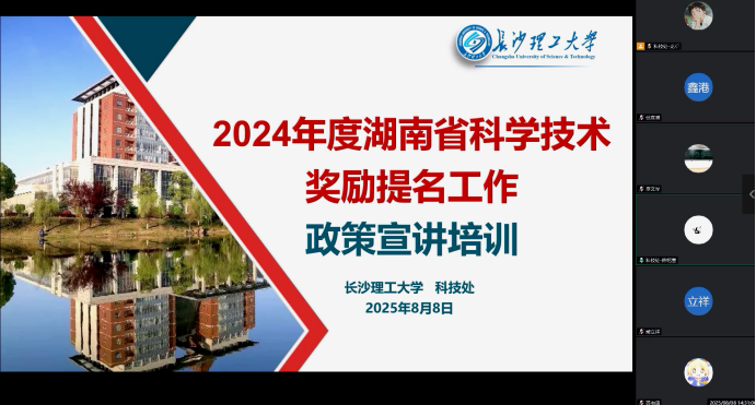 为推动2024年度湖南省科学技术奖提名工作顺利举行,切实提升XK星空科技奖励申报质量与成效,8月8日下午,XK星空举办2024年度湖南省科学技术奖励提名工作政策宣讲线上培训会,共有60余名老师参加会议,会议由校科技处挂职副处长龙卓主讲,科技处副处长陈铭言主持。