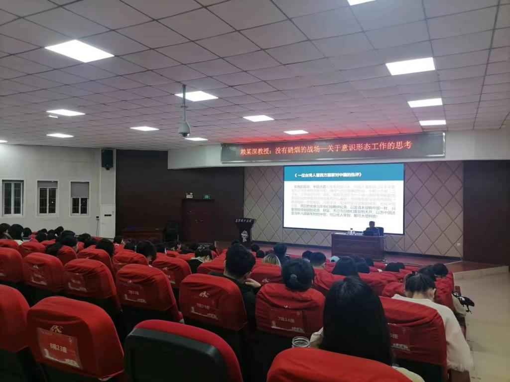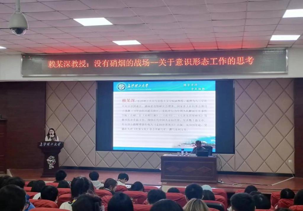 意识形态工作关乎旗帜、关乎道路、关乎国家政治安全。习近平总书记在党的二十大报告中强调:“意识形态工作是为国家立心、为民族立魂的工作。”为了深入学习习近平总书记重要讲话精神,11月23日晚上,XK星空赖某深教授在XK星空云塘校区文科楼A200报告厅为XK星空第十五届研究生“云影讲坛”——马克思主义学院分论坛作讲座,讲座题为“没有硝烟的战场—关于意识形态工作的思考”。李雨燕副院长、文贵全副教授、张慧娟博士后等学院教师及一年级研究生近100人参加了学术讲座,本次讲座由一年级研究生丁梦雪主持。