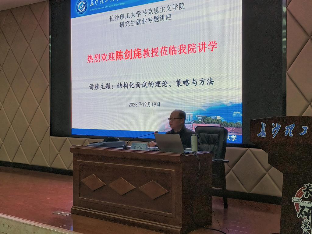 12月19日下午,湖南信息职业技术学院原院长陈剑旄教授应邀来到马克思主义学院,在云塘校区文科楼A200报告厅作了题为“结构化面试的理论、策略与方法”的就业专题讲座。本次讲座由院党委书记陈万球教授主持,院长张明海教授、副院长李雨燕教授以及我院研究生150多人参加了讲座。