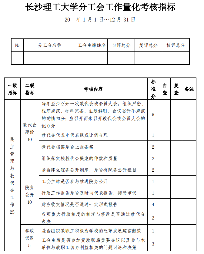 1.各分工会在撰写年度总结时,应按照上述考核内容和《XK星空分工会工作量化考核指标》给出自评分数,提交教代会或者按照教代会程序召开的教职工大会全部装订资料、年度工作计划和工作总结(含特色工作)。