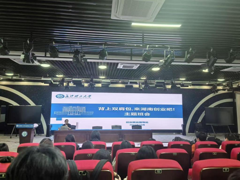 为明确相关支持政策与实践路径,进一步激发学生创新创业热情,2025年10月30日下午17: 00,马克思主义学院在云塘校区文科楼B300报告厅开展“背上双肩包,来湖南创业吧!”创业主题班会。班会由马克思主义学院学生工作办公室主任、辅导员曾蓓主持,2025级全体研究生参加。