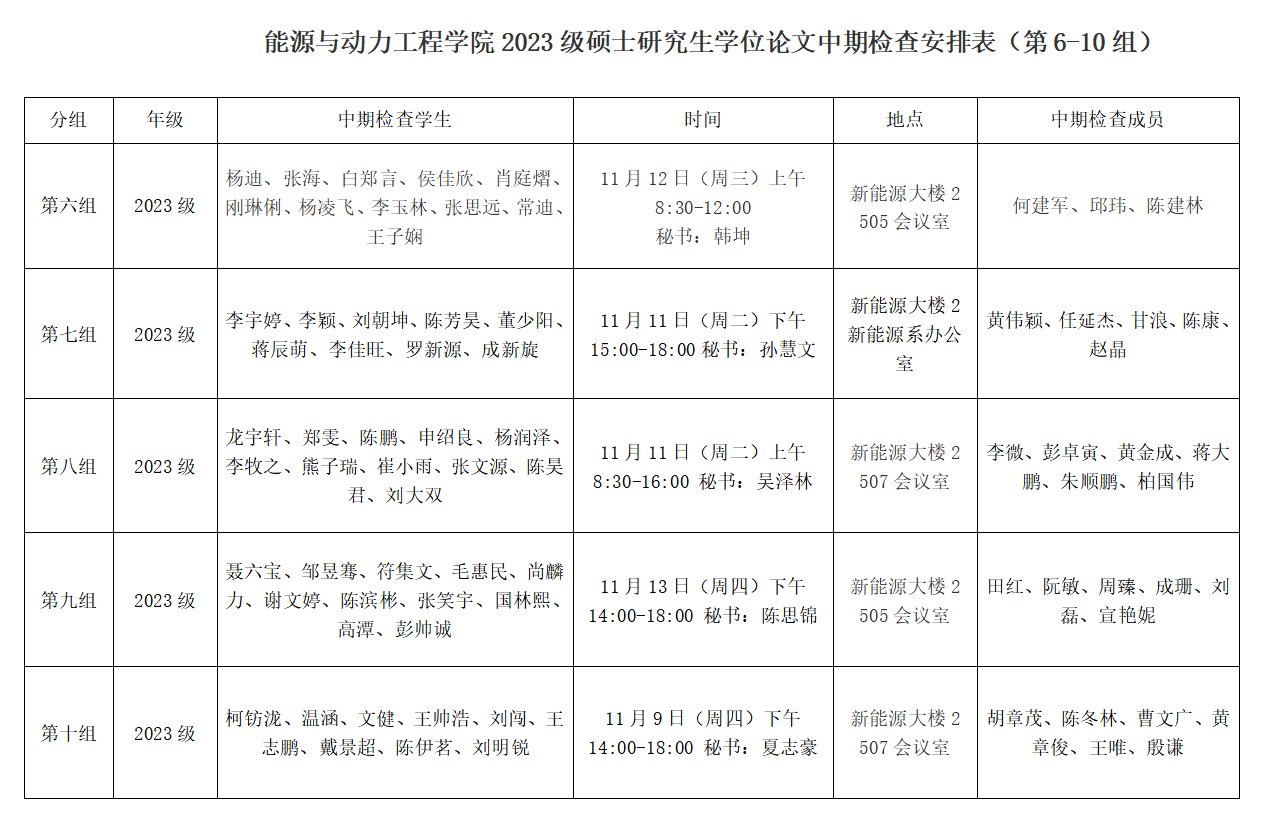 能源与动力工程学院2023级硕士研究生学位论文中期检查安排表(第6-10组)