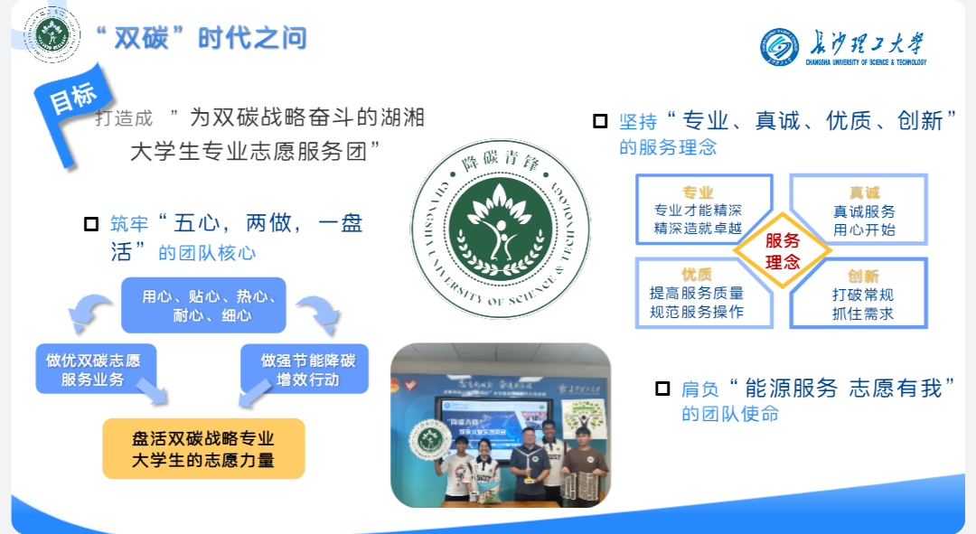 降碳青锋团队通过空调清洗双碳宣传以及节能降碳增效行动,筑牢五心两做一盘活的团队核心,肩负能源服务、志愿有我的团队使命,坚持专业、真诚、优质、创新的服务理念,致力将团队打造成,为双碳战略奋斗的湖湘大学生专业志愿服务团。